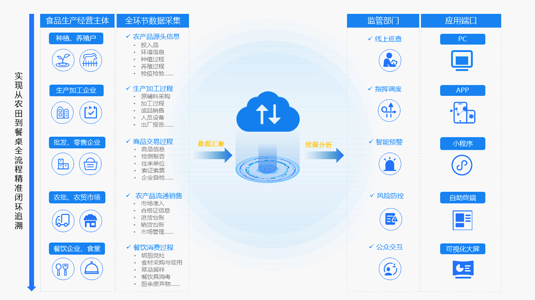 云平台由市场局食品安全监管系统、企业追溯服务系统和消费者查询系统组成,以“一票多用、数据共享、上下联动,全面覆盖”为监管理念,面向7大类型的食品企业提供追溯数据的采集服务,通过采集记录产品生产、流通、消费等各环节信息 ,实现食品安全监管来源可查 、去向可追 、责任可究 ,和产品全过程质量安全管理与风险控制,以科技创新提升食安管理水平和效能。