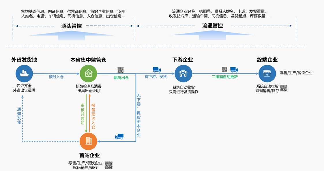 进口冷链食品追溯平台以全程追溯为理念,以“批次二维码”的创新模式,实现全流程、全过程追溯管理。通过对进口冷链食品从产品来源、存储、进集中监管仓消杀、运输到销售使用等全过程的数据采集,构建进口冷链食品全方位、全过程、全环节综合信息化追溯服务管理系统,实现进口冷链食品在安徽省的源头管控、流向管控、分布管控、库存管控、阳性事件管控,最大化推进进口冷链食品 “五证一码”的流通机制 。实现进口冷链食品“来源可追溯、去向可查证”,增强进口冷链食品生产经营者的守法经营意识,提振消费者对进口冷链食品消费安全的信心。