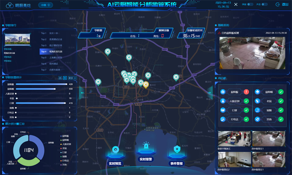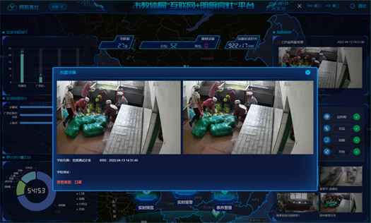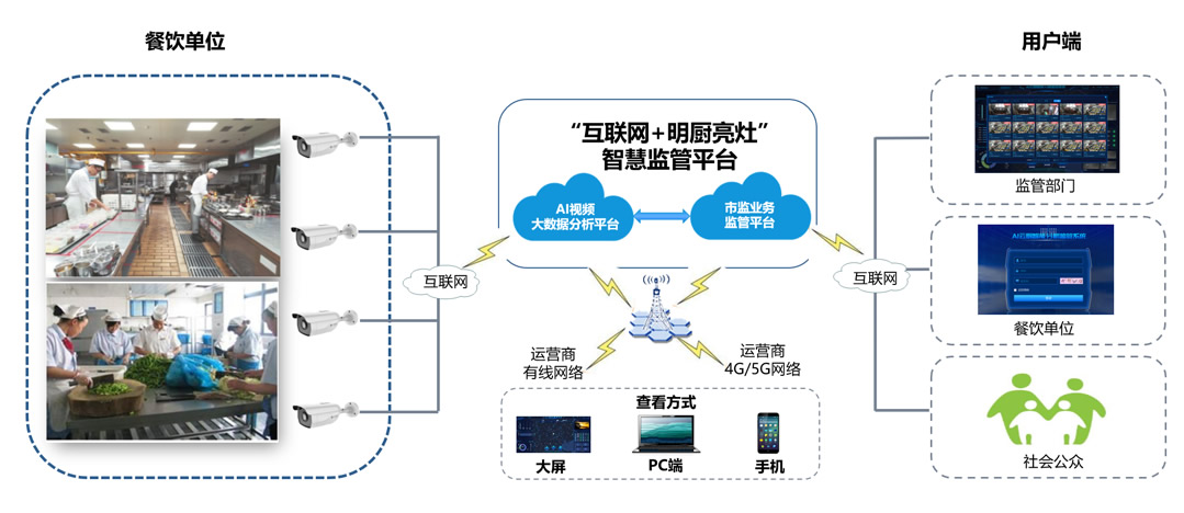 依托强大的视频能力打造面向政府、企业和公众的“互联网+明厨亮灶”智慧监管平台,围绕业务监管、视频汇聚与转发、AI智能分析等功能,并可实现与第三方平台进行数据对接,实现创新监管模式,主要针对餐饮单位的后厨烹饪间、消洗间、切配间、配餐间等重点区域进行实时监控。